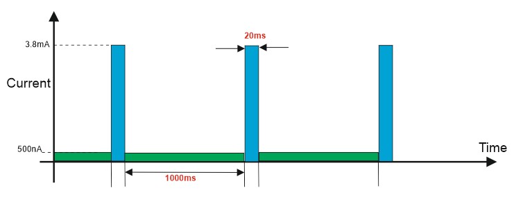 Resulting average current is 75µA, ideal for long-life battery. Custom duty-cycle configurations are available on request.