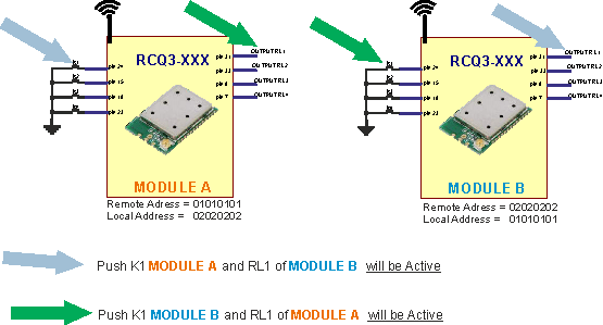 The 4 Output of MODULE A (RL1,RL2,RL3,RL4) corrisponding to the 4 Input of MODULE B (K1,K2,K3,K4), the 4 Output of the MODULE B corrisponding to the 4 Input of the MODULE A. The system can be work in :